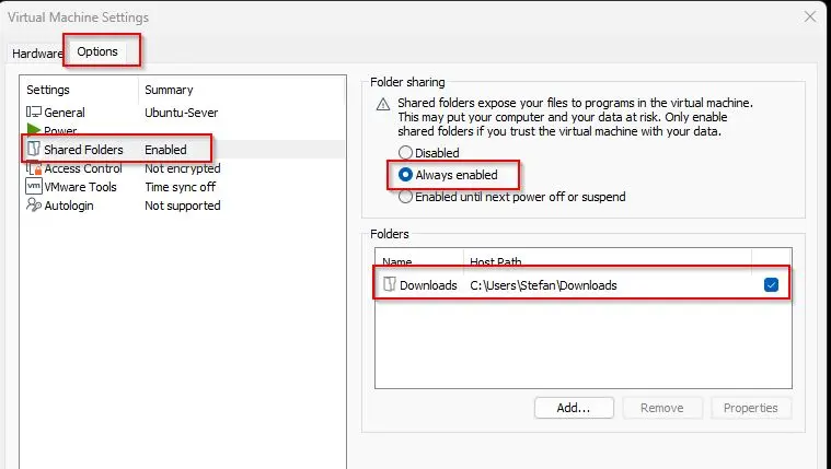 Zuerst richtet man im VMware Player in den Einstellungen des virtuellen Servers das gemeinsame Laufwerk ein, also ein Verzeichnis des Host Rechners, auf den die VM zugreifen können soll. Bei mir ist das der Downloads-Ordner.